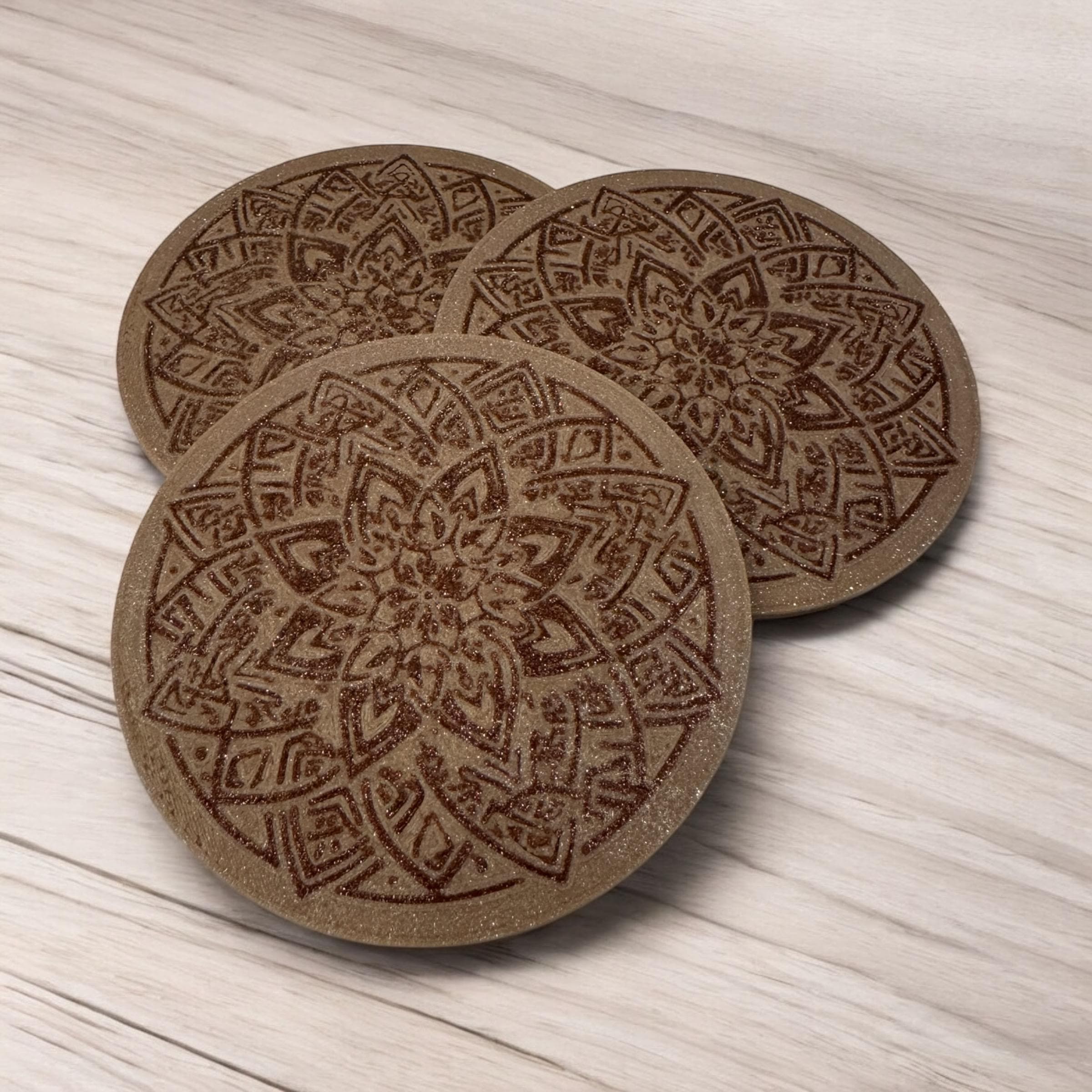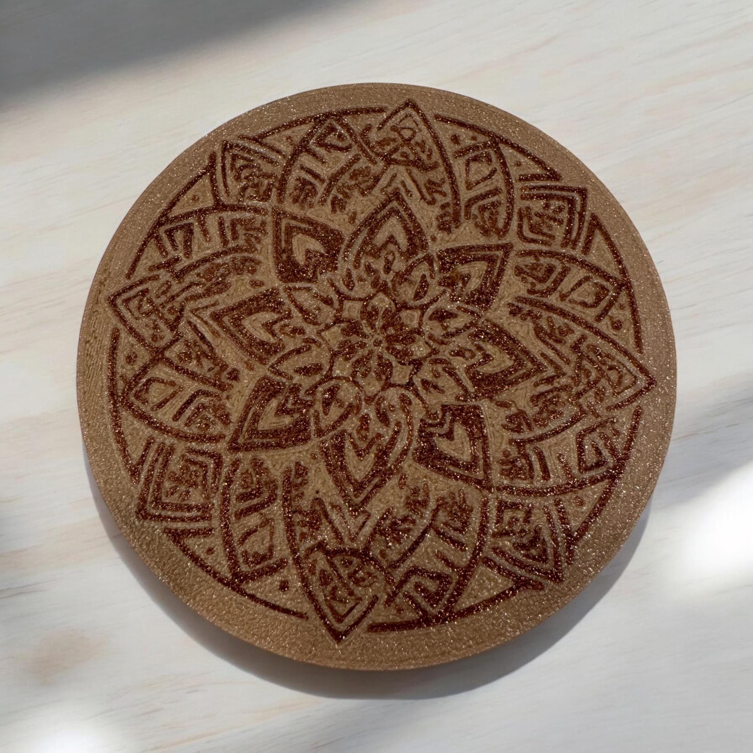 This 3D printed mandala art coaster features an intricate geometric design, perfect for adding a touch of bohemian elegance to your space. Ideal for any home or office, it makes a thoughtful gift or a unique addition to your décor. Available in a variety of color combinations to suit your personal style.