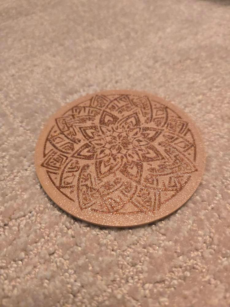 The coasters are a nice addition for my decor. The Mandela design is done in a pretty iridescent copper color. Quality is great and quick shipping. Will be ordering other items from this business soon!